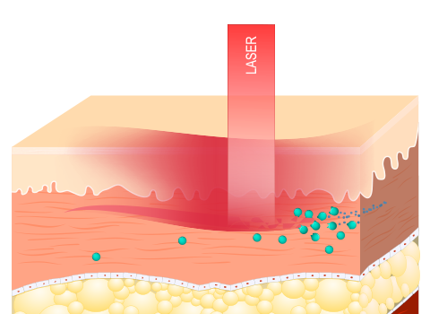 시술 부위에 고출력 레이저를 조사하여 멜라닌 세포를 파괴하고, 콜라겐 재생을 유도합니다.